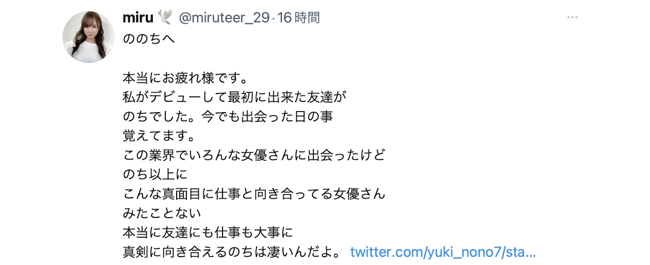 所以結城宣布引退的同時miru也在社群同步轉推,說自己永遠記得兩人第一次相見,也承諾未來即便兩人都退休了都還會是好朋友ー這一行真心的友情難得,miru和結城不管怎樣每個月都要聚餐真的不容易,結城退了,我想miru一定會覺得很寂寞吧~