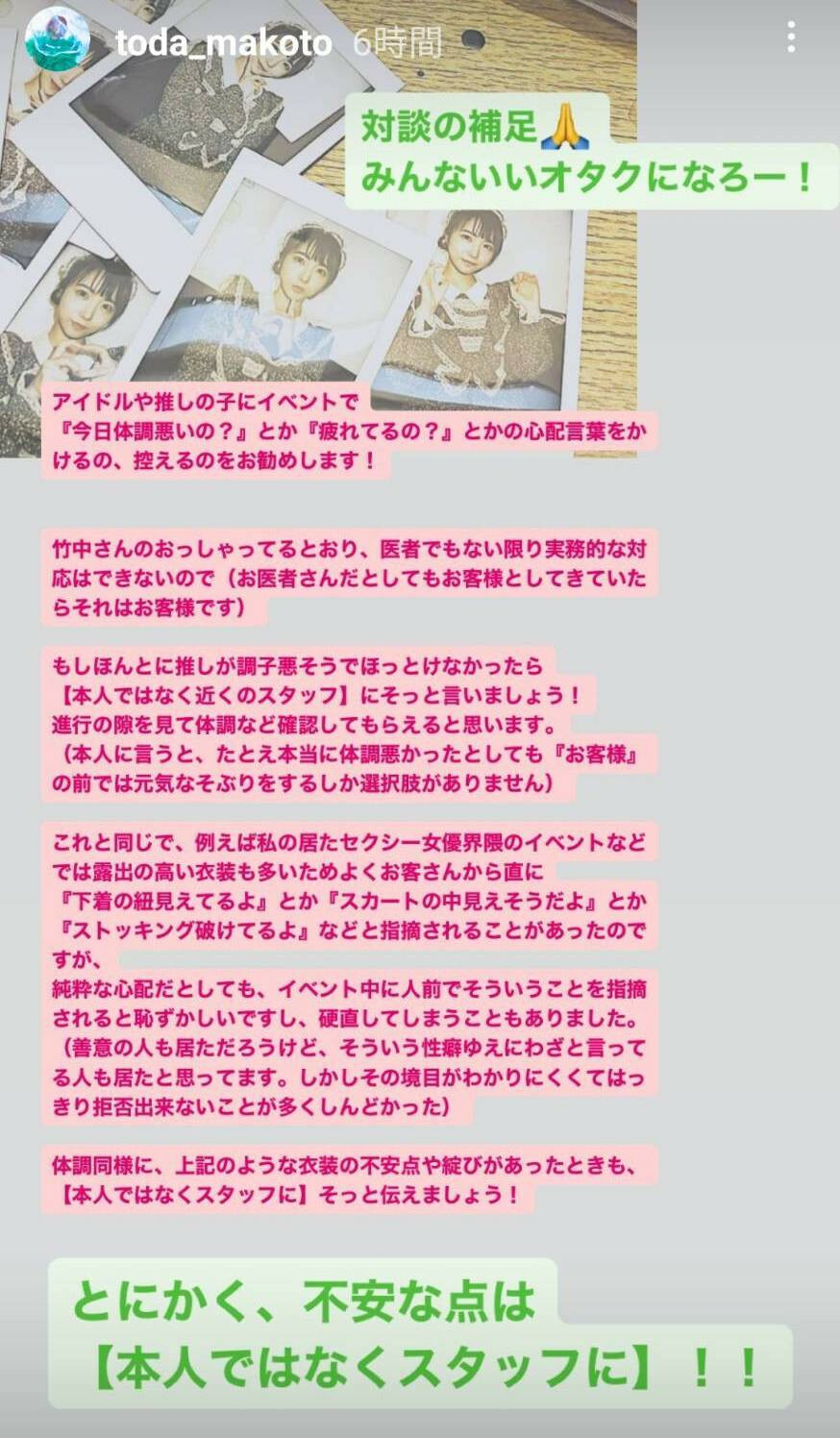 就戸田真琴的說法,很多時候女優也知道自己狀況不好,這時候你突然去關心她是不是身體有恙,會讓她們覺得自己掩飾得很爛,那不會讓女優感受到被關懷的溫暖反而會讓她們心情變糟;還有另一種人喜歡和女優抱怨主辦單位,對,或許活動真的辦得很爛,但直接和女優反應你是想要得到什麼回應?是要她和你一起罵主辦單位、還是直接去和主辦單位說她不做了?