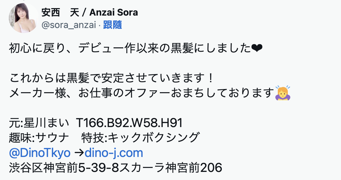 直接來翻這篇發文好了:從現在開始,我將要受事務所Dino照顧了並且改名為「安西天」,從星川まい(星川舞)時代就支持小妹我的粉絲和片商,讓我們一起為了成為最頂尖的女優而努力吧〜