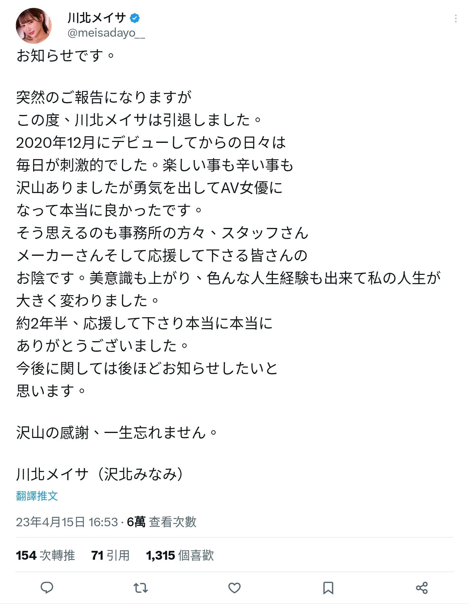 不是才回歸原來的事務所然後把名字改回來了?結果兩個月多的時間過去,片商FALENO STAR出道、當初號稱是9頭身超小顏Face的天然白虎「川北メイサ(川北明沙)」突然在今天宣布引退,真是一整個奇怪⋯