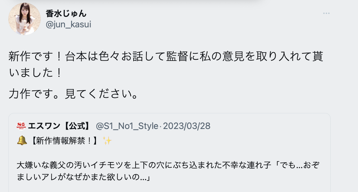 不過有件事倒是大家都一樣,那就是秀出購買作品的證明,那女優們都會非常高興地和你說謝謝。而今天的主角香水じゅん(香水純)嘛,則是希望大家去看自己才剛發售的作品『大嫌いな義父の汚いイチモツを上下の穴にぶち込まれた不幸な連れ子「でも…おぞましいアレがなぜかまた欲しいの…」 』: