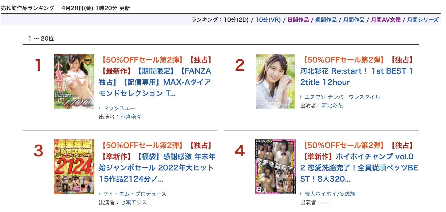 那就是對折促銷第二彈(50%OFFセール第2弾)的超豪華精選輯「MAX-Aダイアモンドセレクション THE LEGEND 小倉奈々 オグナナのデビューからの軌跡を惜しみなくお届けスペシャルBEST ~フル尺1400分~」,這支作品已經連續好幾天在FANZA的串流排行榜稱王,什麼河北彩花三上悠亜的通通被輾壓⋯