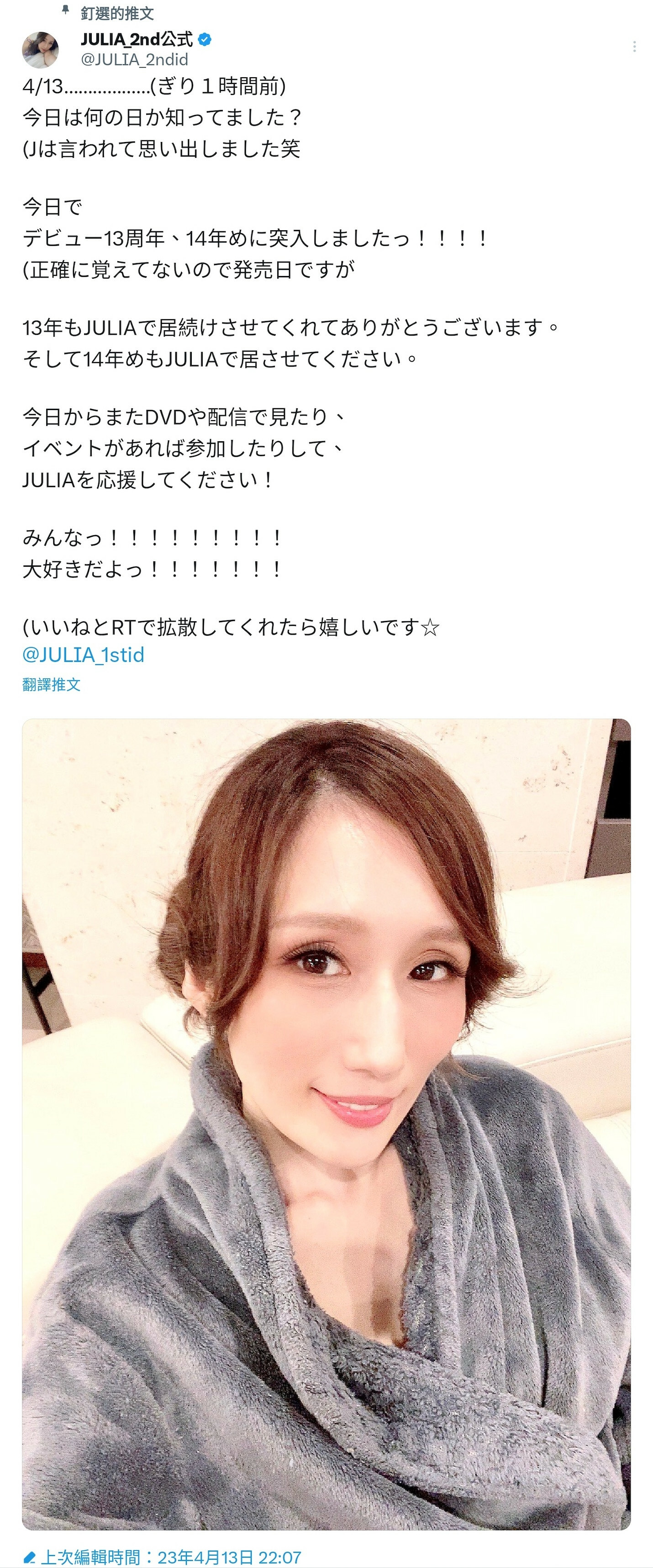 是的,13年前的4月13日,Julia以「B100 W55 H84 DEBUT JULIA!!!」這支作品正式加入AV界,大家還記得當初片商E-Body是怎麼打造這位專屬女優嗎?其實和現在很像,除了強調Julia有著超越想像的Super Body外就是在預告片中盡量避免讓她露出廬山真面目⋯