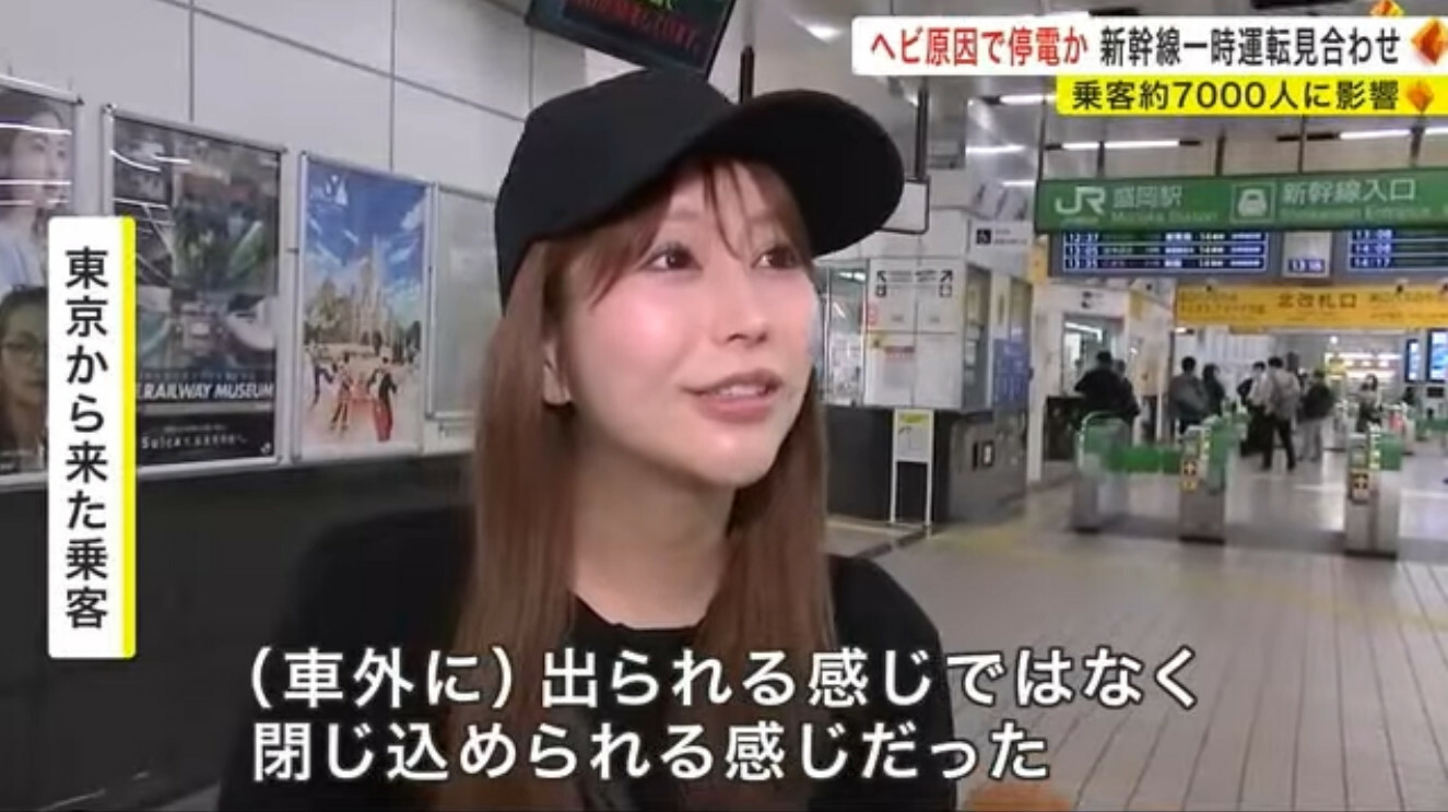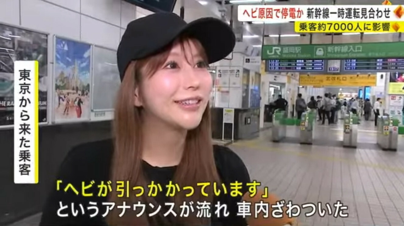 這樣的她為什麼可以上電視?因為日本的東北新幹線在前天(5/17)中午11點的時候停電兩小時,到了下午一點才恢復通車,JR東日本的工作人員到了現場發現是因為蛇觸電導致運輸停擺,排除後恢復通車〜