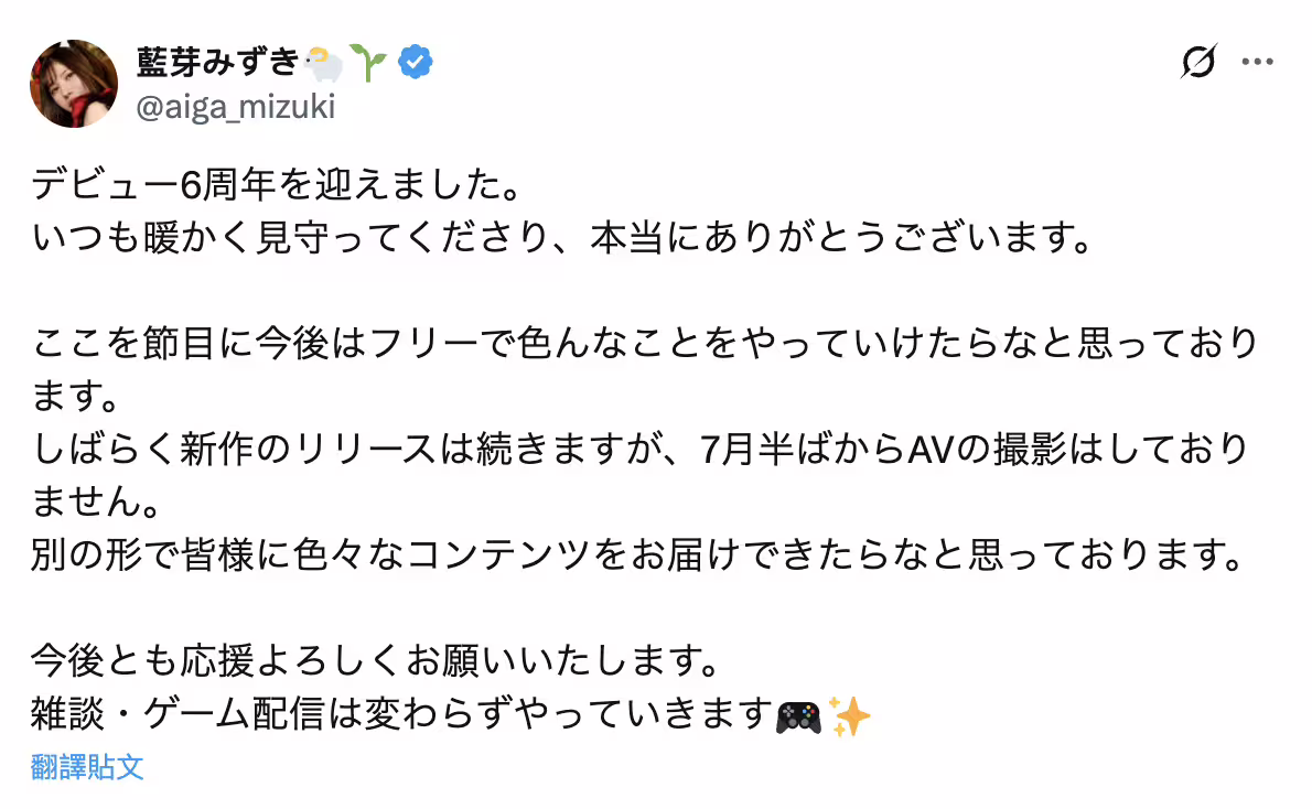 她是在社群上發表聲明:首先,藍芽みずき(藍芽瑞季)感謝大家自出道以來的照顧,不過接下來她想做點變化ー簡單說吧,雖然作品還會繼續發行一段時間,不過藍芽是7月中旬開始就沒有進行任何AV作品的拍攝,之後,她要以自由之身去闖一闖、嘗試在各個不同的領域發展: