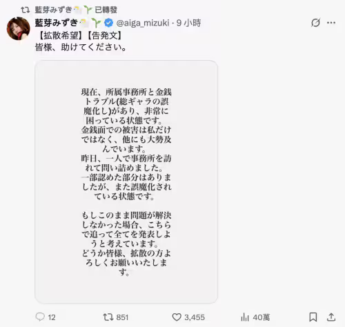 昨天,我獨自前往事務所討公道,雖然對方承認了部分問題,但還是在打馬虎眼,如果這件事情再不解決,我將會把所知的部分公開,也拜託大家多多轉發擴散,謝謝。