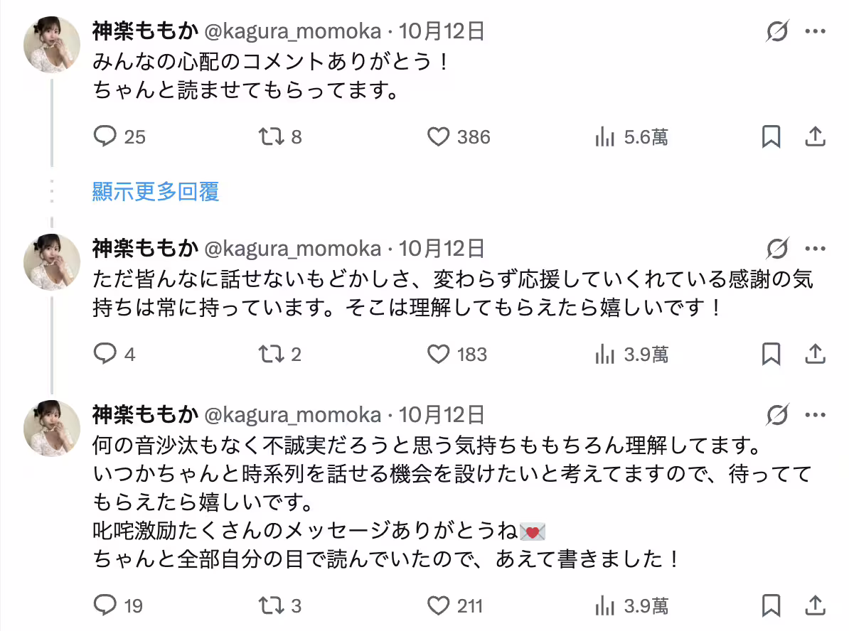 怎麼回事?其實就我所知,神楽ももか(神樂桃果)幾乎天天上線,發私訊她也會看,只是大多不會回覆ー她當然也知道很多人關心自己,於是就在社群回答了大家的疑問: