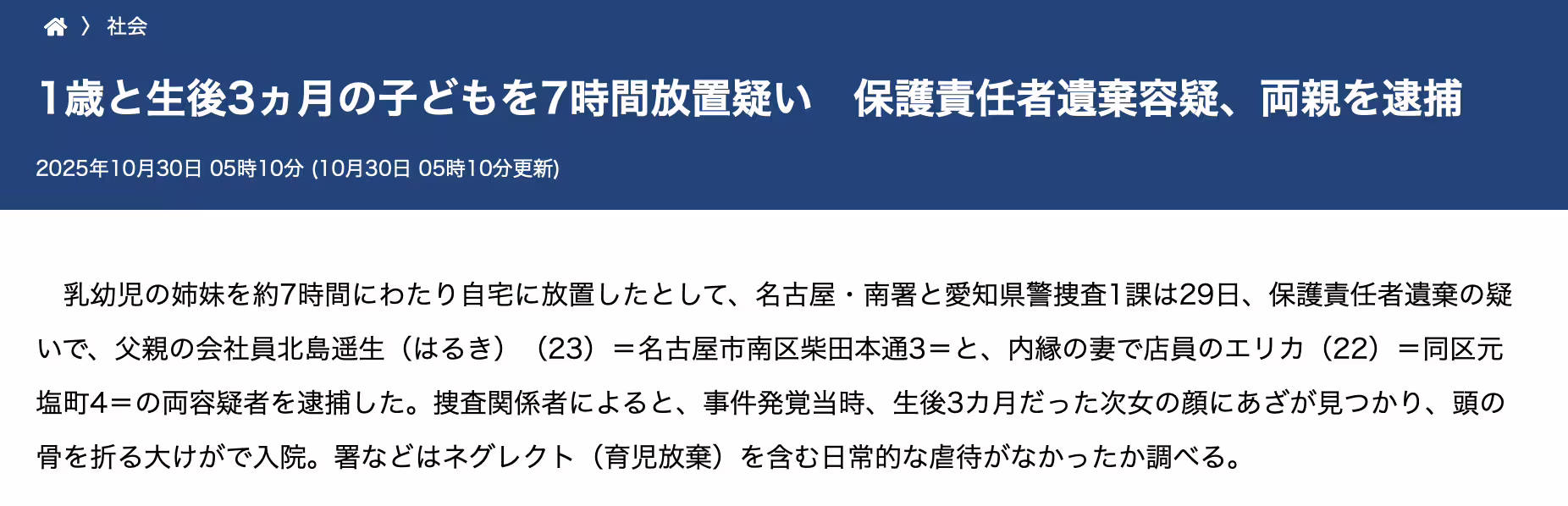 新聞就是上面這篇,在名古屋,警方逮捕了一對夫妻,他們把1歲大的長女和3個月大的次女丟在家裡不管,當警方前去探視的時候,發現才3個月大的小女兒臉上有瘀青然後還有骨折的狀況⋯這讓絵恋空感同身受,因為她小時候也有差不多的狀況: