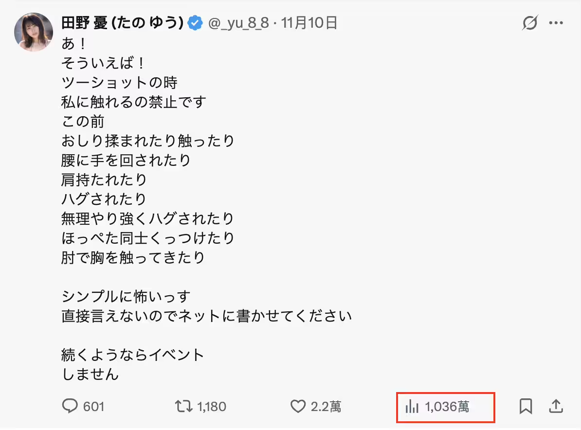 簡單來翻譯一下田野憂寫了什麼:她是呼籲粉絲在合照的時候「別碰我」,因為在之前有人揉她的屁股、從後面揉她的腰、把手搭在她的肩上、強行擁抱她、故意臉貼臉以及用手肘觸碰她的胸部⋯田野憂說,上述的行為真的讓她覺得很可怕,但她沒有辦法當面說出來,只好在社群上發發牢騷: