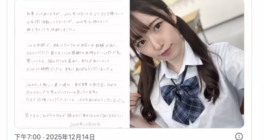 趕在2026年到來之前,上坂めい(上坂芽衣)在社群宣布引退!