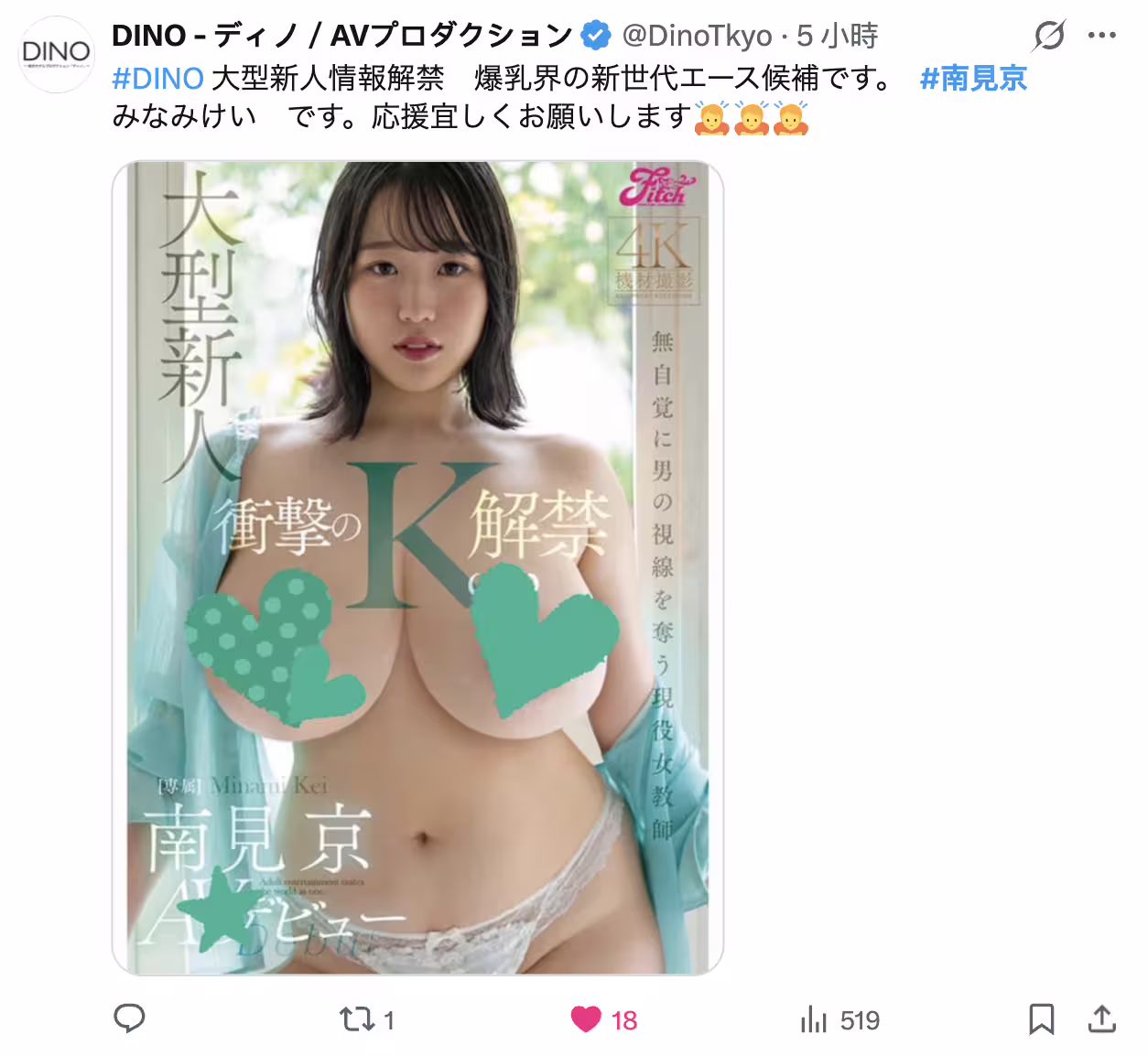 是因為太低調了嗎?應該沒有,雖然到目前本人還沒有在社群出現,但事務所DINO已經在第一時間跳了出來發文,稱南見京是「爆乳界的新世代王牌候選人」;那是只有身材沒有臉蛋嗎?我想這是大家最擔心的事,所以我們就直接來看宣傳影片中的她長什麼模樣吧ー