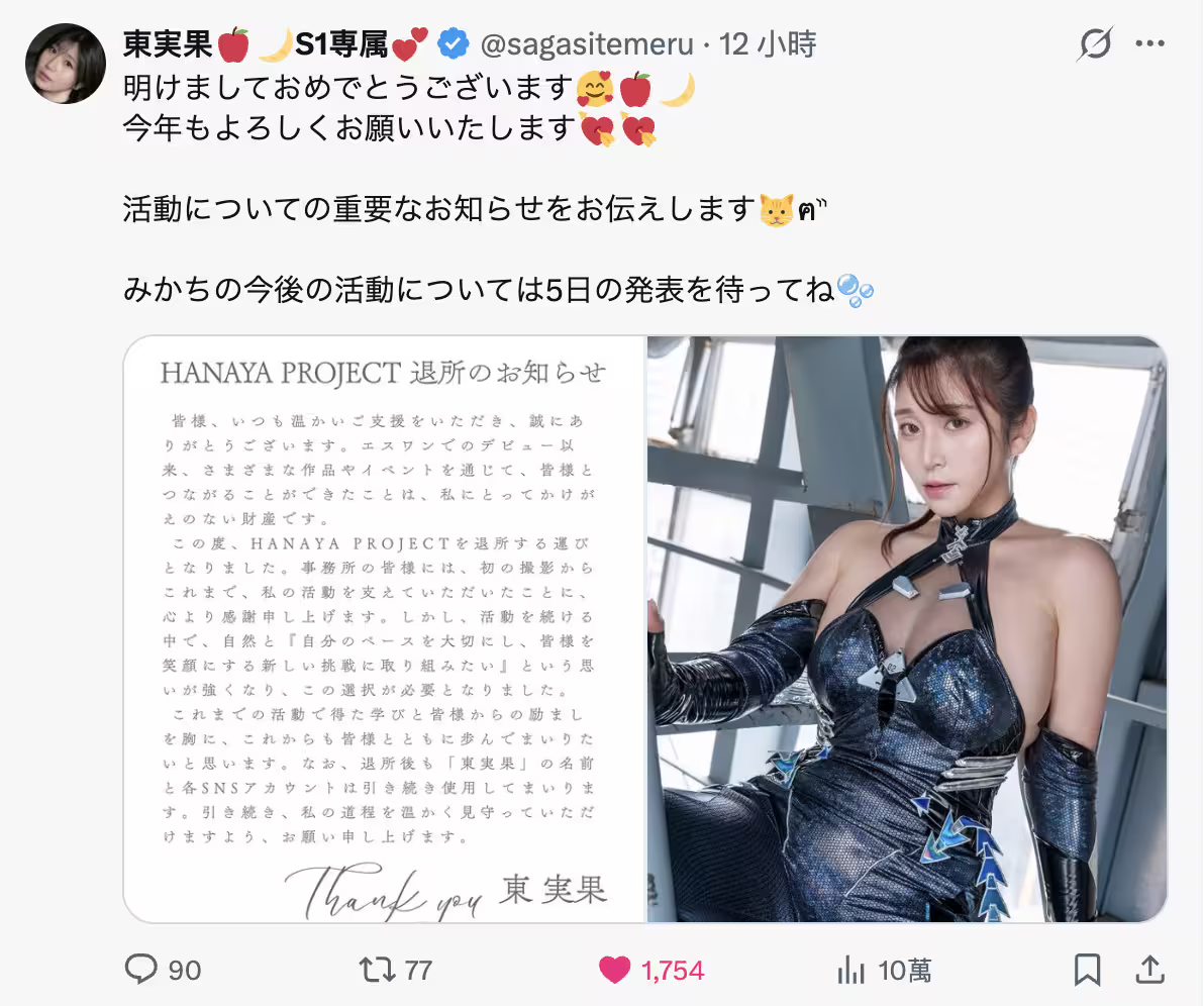 去年6月出道,不公布年紀、被稱為一億人的小三而且有著「比20歲的年代更性感」、「比30歲的年代更奔放」然後「對於40歲的年代來說太可愛」封號的女優東実果(東實果)在社群(https://x.com/sagasitemeru)上宣布退出經紀公司Hanaya Project,目前是無事務所的狀態: