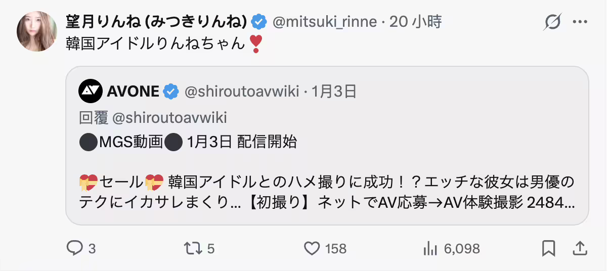 應該有些人反應過來了,望月りんね(望月凜音)?她不是在Ideapocket(IP社,アイポケ)於去年6月出道、號稱又可愛又漂亮又敏感的新生代女優嗎?怎麼會到了MGStage這個串流平台變成韓國偶像?答案很簡單,那就是望月りんね(望月凜音)不再是Ideapocket的一員,雙方合作只到去年11月為止,而且在Ideapocket在社群上發表的賀歲圖卡上也找不到她的身影,就是被蛋雕惹〜