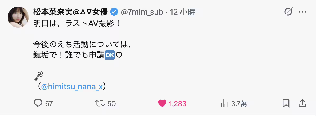 也難怪她要退社離開事務所了,因為不用拍片了,所以也不用研究離開事務所後松本菜奈実和片商之間要如何連結了;第二個重點則是松本菜奈実有提到,今後色色的活動(えち活動)將會在私密的小帳公布ー在這邊和大家介紹一下,松本菜奈実用的是「鍵垢」,鍵,就是鑰匙的意思,也就是說這帳號是有上鎖的,必須要松本菜奈実同意才能追蹤,現在是只要追蹤她就OK,之後就不知道了⋯