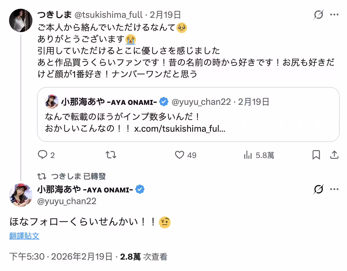 這是「小那海あや(小那海綾)」最近流量爆表的一張照片,不過很可惜,爆的地方不是她的X,而是拿了她的圖另外發文的「粉絲」;對此小那海あや(小那海綾)不但轉推那位仁兄的發文而且還對為什麼對方比她這個作者流量還高感到不解;結果那位「粉絲」收到小那海本人的聯絡時竟然說真是太感謝了,然後強調自己是會買片的粉絲,小那海あや(小那海綾)是他最喜歡的女優: