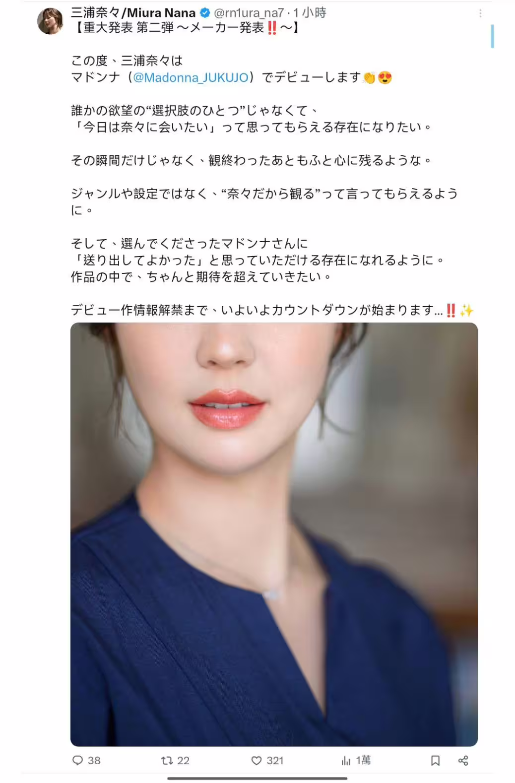我是沒有想到這位新人是直接宣布片商而不是用出道作情報解禁來公布答案,所以沒有考慮到Madonna這個答案,對不起,我錯了;而在確定片商之後,三浦奈々在X(https://x.com/rn1ura_na7)寫下了出道的心願,她希望自己不是大家看片的選項之一,而是大家的唯一選擇;她不希望大家看完片發洩完就算了,而是希望大家看完片子後還能在心裡悸動不已;最後,她非常感謝Madonna的賞識,會全力以赴成為讓這家片商覺得「能和她合作真的太好了」的存在⋯