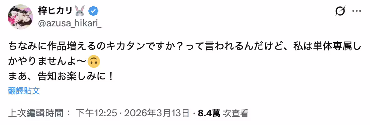結果梓ヒカリ(梓光莉)的回覆是:「有人在問是不是因為成為企画単体女優所以發片增加了?不是喔,不是這個樣子喔,我只會接專屬女優的工作喔~」